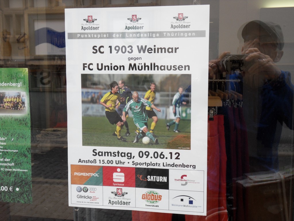 Nog naar aanleiding van Bachs overgang van Mühlhausen naar Weimar: in Weimar zag ik gisteren de aankondiging van een voetbalwedstrijd die aanstaande zaterdag wordt gespeeld: SC 1903 Weimar – FC Union Mühlhausen. Ik ben benieuwd of er tussen deze steden nog steeds een Bach-controverse is.